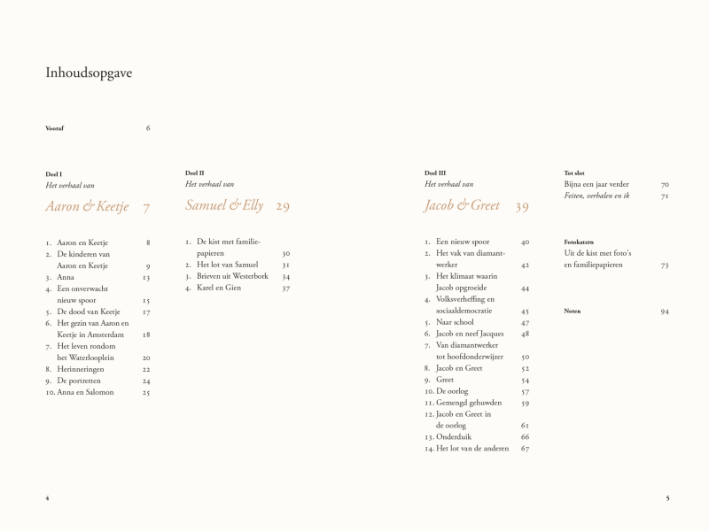 Het boekje is opgedeeld in drie delen: 1 Aaron & Keetje, 2 Samuel & Elly en 3 Jacob & Greet. Het verhaal van Anna is hier doorheen geweven.