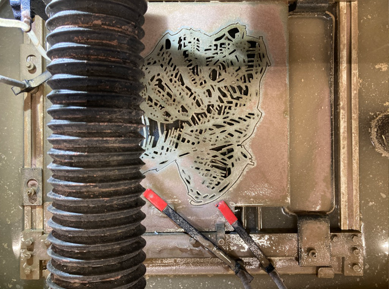 Omdat papier, waar ik normaal mee werk, niet lang stand houdt in weer en wind, hebben we Spark Makers Zone uit Den Bosch ingeschakeld. Daar is de tekening met water en zand uit 2 mm dik staal gehaald. Na een uurtje schuren en lakken kon het opgehangen worden op een plekje midden in de wijk. Daar is het 17 juli onthuld.