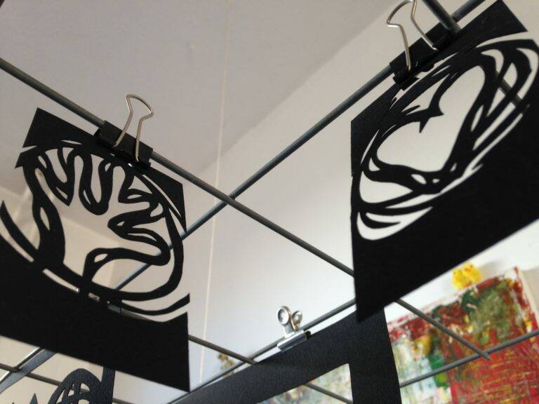 De belangrijkste symbolen zijn water, aarde, vuur en lucht. Hiervan heb ik tekeningen gemaakt die later zijn uitgesneden. Zij vormen samen de stofomslag en komen terug als illustratie. Omdat Gea veel met vilt werkt en dit ook een wisselwerking heeft met haar praktijk, en omdat één van de vertelde mythen over Theseus en Ariadne gaat, is de draad als ander symbool verwerkt: door de extra letter Shoreline en de binding met cahiersteek (beide in rood). Het te kiezen papier was belangrijk, het moest prettig en warm aanvoelen. Ongestreken papier dus, voor het stofomslag ietsje ruwer. Omdat het papier van het binnenwerk door recycling grijzig oogt, is het kleurgebruik helder en fris gehouden.