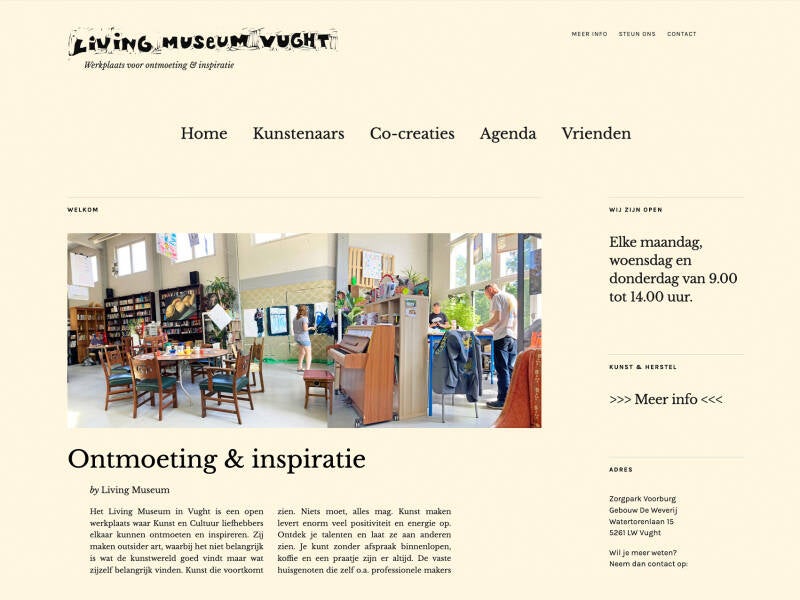 Sinds de start van het Living Museum Vught ben ik verbonden als vaste huisgenoot. Op deze inspirerende plek is iedereen welkom voor het maken van en kijken & luisteren naar kunst. Er zijn veel disciplines die hier samenkomen, van tekenen, schilderen, schrijven tot rap, spoken word, animatie, textiele werkvormen en grafiek.