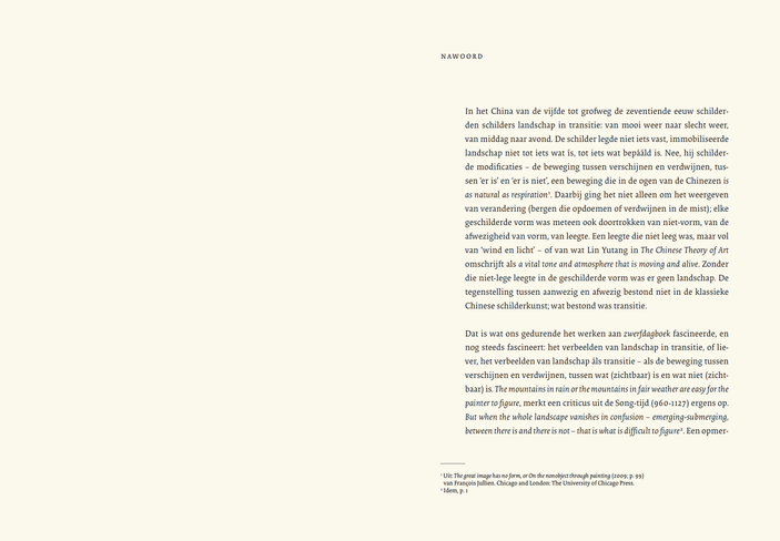 zwerfdagboek is een bundeling van tekeningen, etsen, krijtdrukken, pinholes, landschapspoëzie, dagboeknotities en filosofische fragmenten waar Puck Willaarts en Han Leeferink vijf jaar aan hebben gewerkt. De Chinese landschapsfilosofie vormde een belangrijke inspiratiebron. Het ritme van het water, de wind, de wolken en het veranderlijke licht van het natuurgebied ten zuiden van ’s-Hertogenbosch, in het stroomgebied van de Dommel, hebben zij met dit boek zicht- en voelbaar gemaakt.